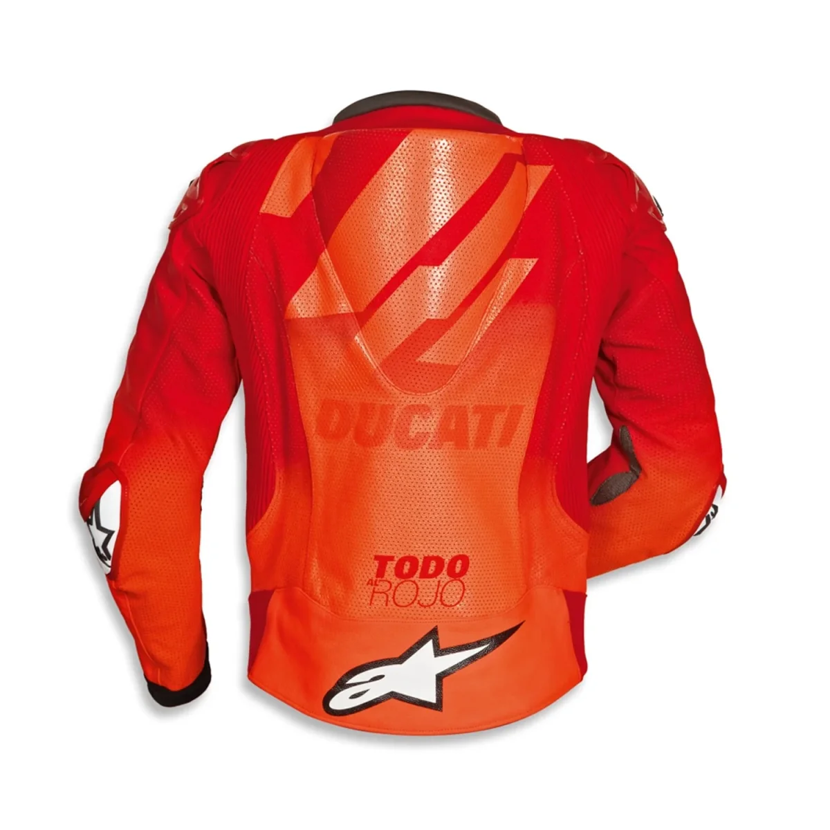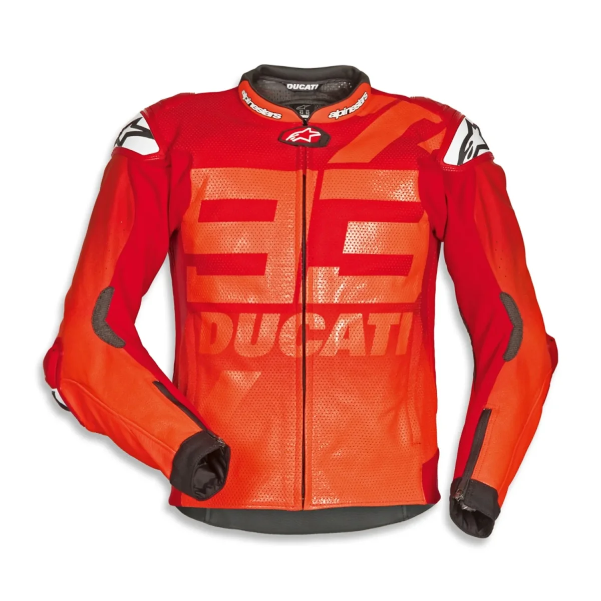 Il giubbino in pelle Replica MM93 è ispirato alla livrea “Todo Rojo” utilizzata nei test dal pilota ufficiale Ducati Marc Marquez. Prodotto in serie limitata da Alpinestars in esclusiva per Ducati, è una giacca che si distingue non solo per le sue prestazioni,testate in pista, ma anche per la realizzazione in pelle di prima qualità e per la presenza di pannelli elasticizzati strategicamente posizionati, a garanzia di ottima vestibilità, comfort e flessibilità. La costruzione precurvata delle maniche, il collo in microfibra e gli elastici su giro manica e interno braccio assicurano una maggiore libertà di movimento al pilota. È un capo certificato secondo le più recenti normative, sapientemente realizzato in pelle bovina super-perforata dello spessore di 1,3 mm. Il resistente rinforzo interno in tessuto tecnico su spalle e gomiti e la gobba aerodinamica assicurano al pilota una protezione eccellente, senza rinunciare alla performance. Le predisposizioni per l’inserimento del paraschiena e del paratorace permettono di godersi ogni curva in totale sicurezza. Le stampe sfumate che giocano con i toni di rosso conferiscono al capo un carattere inconfondibile, rendendo la guida sportiva su strada un concentrato di pura adrenalina.