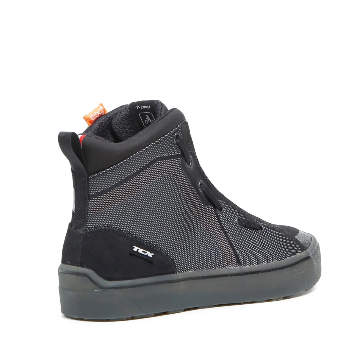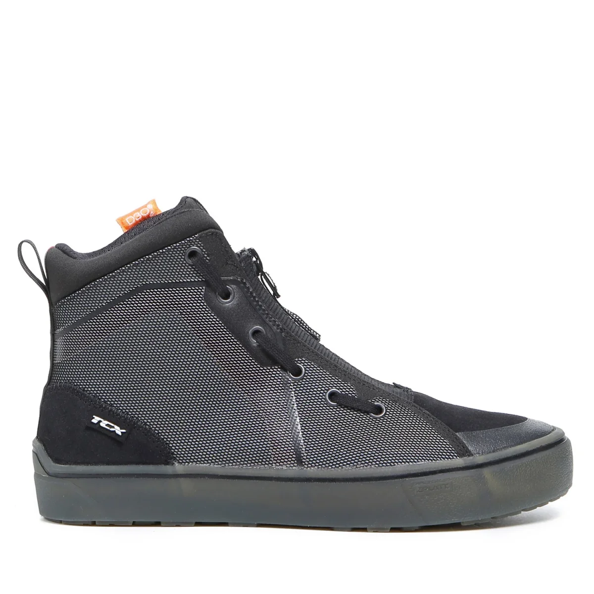 Zplate® permette alla scarpa di seguire tutti i naturali movimenti del piede sia in sella che in fase di camminata, ma allo stesso tempo protegge evitando lo schiacciamento della scarpa stessa in caso d’impatto. La tomaia, realizzata in tessuto mesh rifrangente con inserti in pelle scamosciata, presenta lacci laterali e zip elastica frontale per la chiusura della scarpa, facilitandone la calzata.