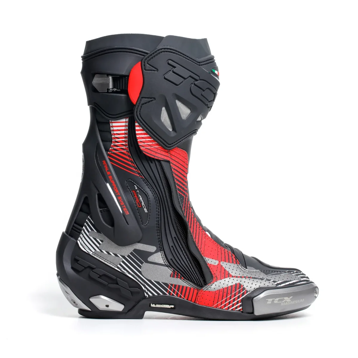 Lo stivale da moto RT-Race Pro Air è il modello di punta della linea Racing, nato dalla collaborazione tra il Reparto di Ricerca e Sviluppo TCX e i piloti impegnati in MotoGP. RT-Race Pro Air integra Fasten Fit Control, un sistema di allacciatura interno collegato alla fodera dello stivale attraverso un laccio a scorrimento rapido, che consente il massimo avvolgimento della tomaia sul piede e una personalizzazione millimetrica della vestibilità.